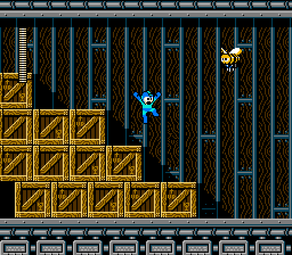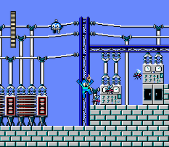 The color of the background tile set of Volt Man's stage during the outside sections clash with the foreground tiles. I wish they were darkened more like the underground portion, making it clear what is and isn't collideable geometry at first glance.